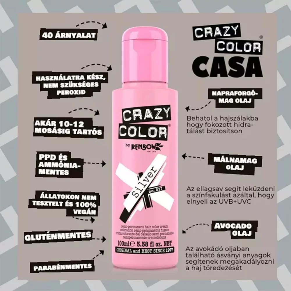 Descoperă magia nuanțelor intense cu Crazy Color, crema de colorare a părului care a câștigat inima stilistilor și a celor pasionați de tendințe timp de peste 40 de ani. Cu o textură cremoasă și o aplicare simplă, oricine poate obține cu ușurință un păr colorat strălucitor chiar din confortul propriei case.
